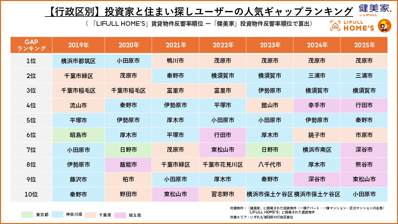 【行政区別:投資家と住まい探しユーザーの人気ギャップランキング】郊外エリアが多くランクイン。東京都のランクインは日野市と昭島市のみ