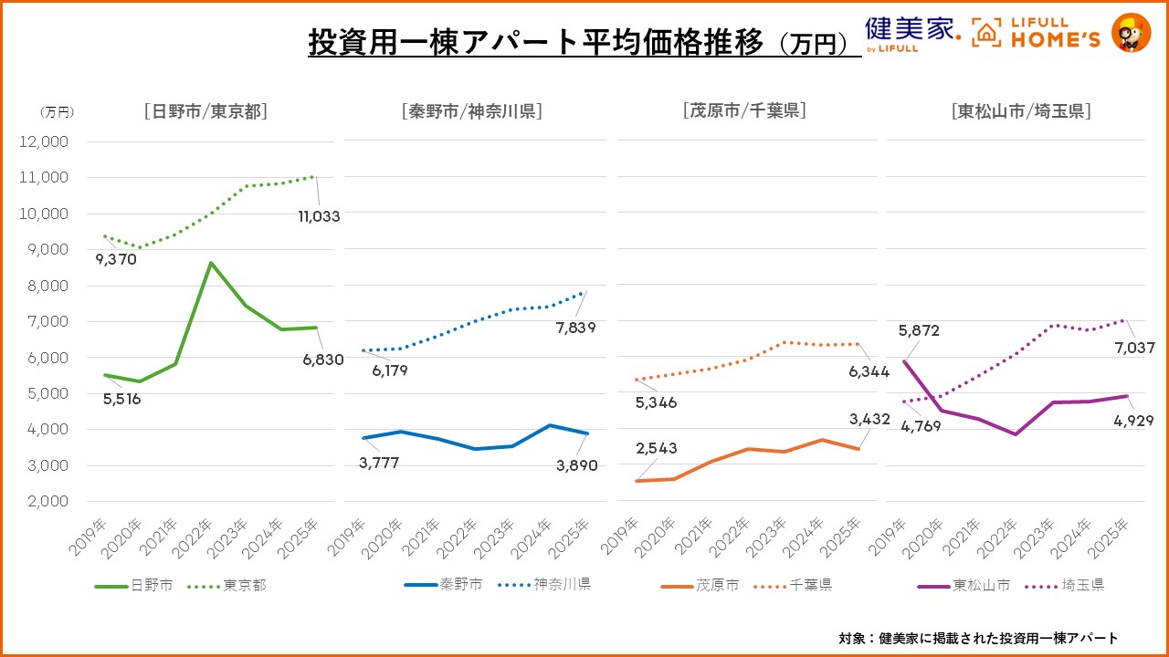 投資家と住まい探しユーザーの人気ギャップランキングにランクインした1都3県の代表エリアの投資用一棟アパートの平均価格推移を比較しました。