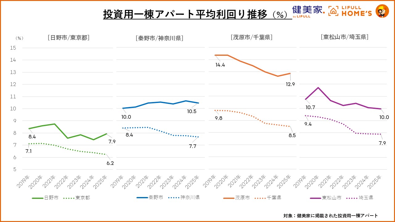 投資家と住まい探しユーザーの人気ギャップランキングにランクインした1都3県の代表エリアの投資用一棟アパートの平均利回りを比較しました。