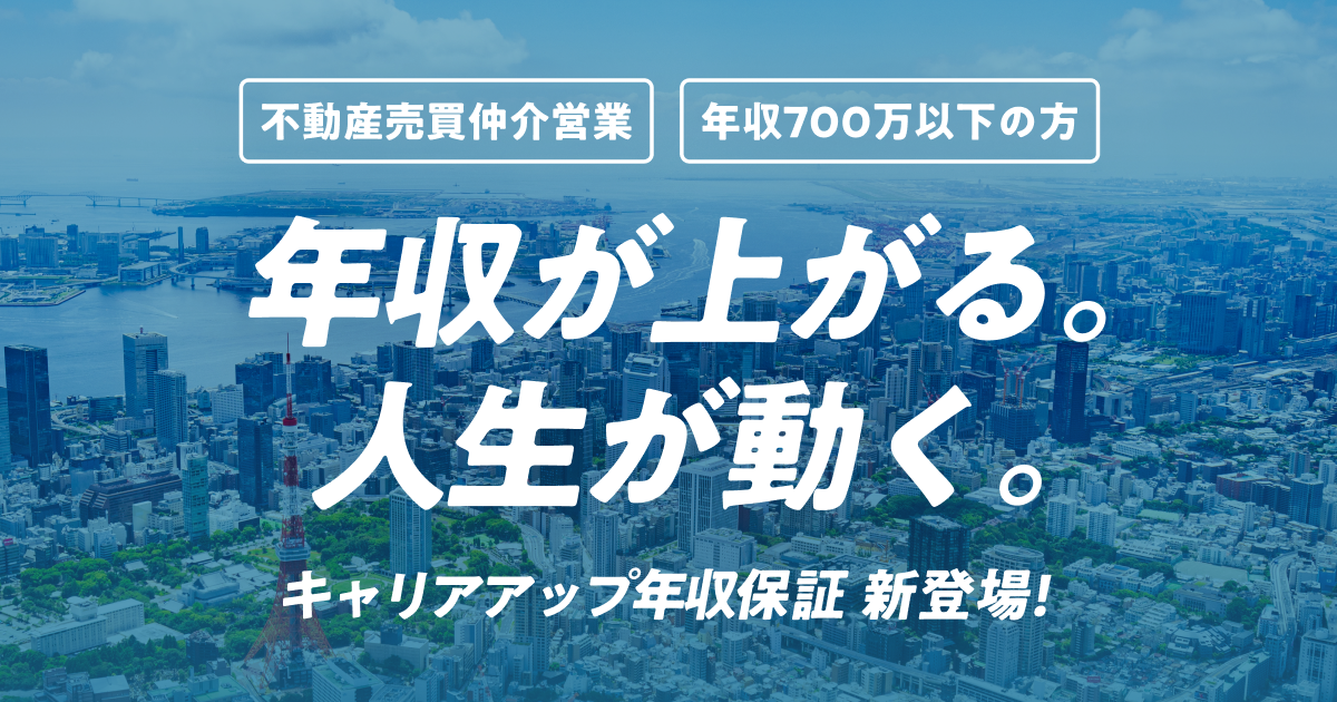 「キャリアアップ保証」は首都圏に在住し、不動産売買仲介営業の実務経験を3年以上の方を対象とし、年収500万円以上の保証、かつ高歩合50%と手厚いサポート体制により、現年収を大きく上回る収入を目指すことができる特別プログラムです。