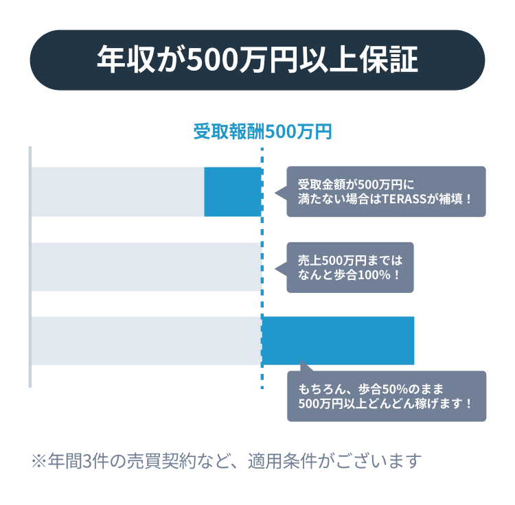 年収500万円以上を保証し、かつ高歩合50%と手厚いサポート体制