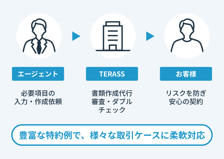 現役エージェントからも評価が高い、TERASSの「契約書・重説作成代行」。事務作業をTERASSが巻き取ることで、前職の倍以上の時間をかけてお客さまに向き合えると好評です。