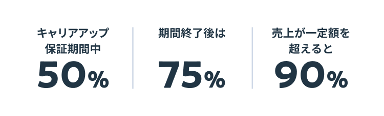 キャリアアップ保証期間中のコミッション(歩合)は50%、その後は75〜90%で、少ない案件数でもしっかり報酬につながります。