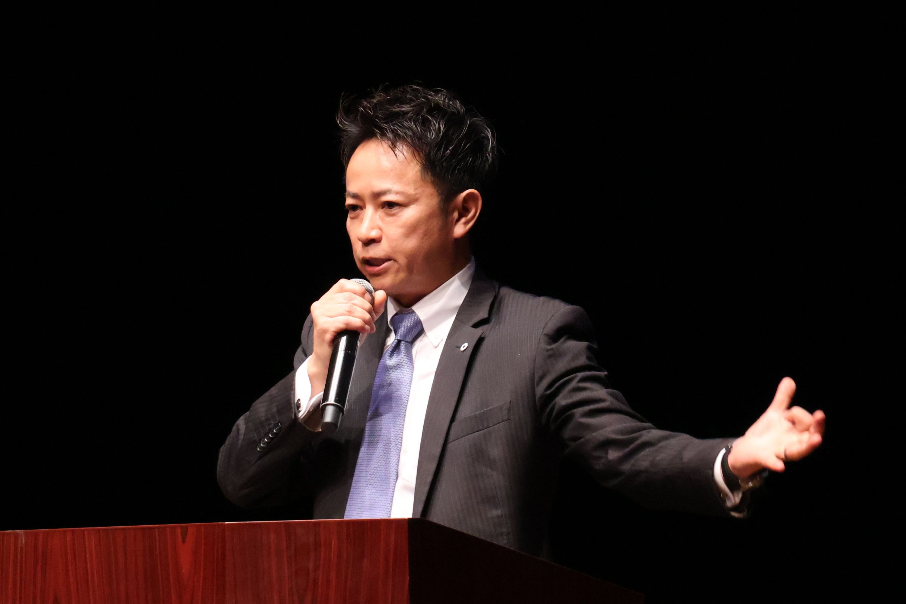 住宅業界の現状と今後について講演。住宅価格の高騰や選択肢の増加により家を建てる人が減っている現状を、データをもとに共有。持ち家のメリットをいかに伝えるかが大切であると呼びかけました。