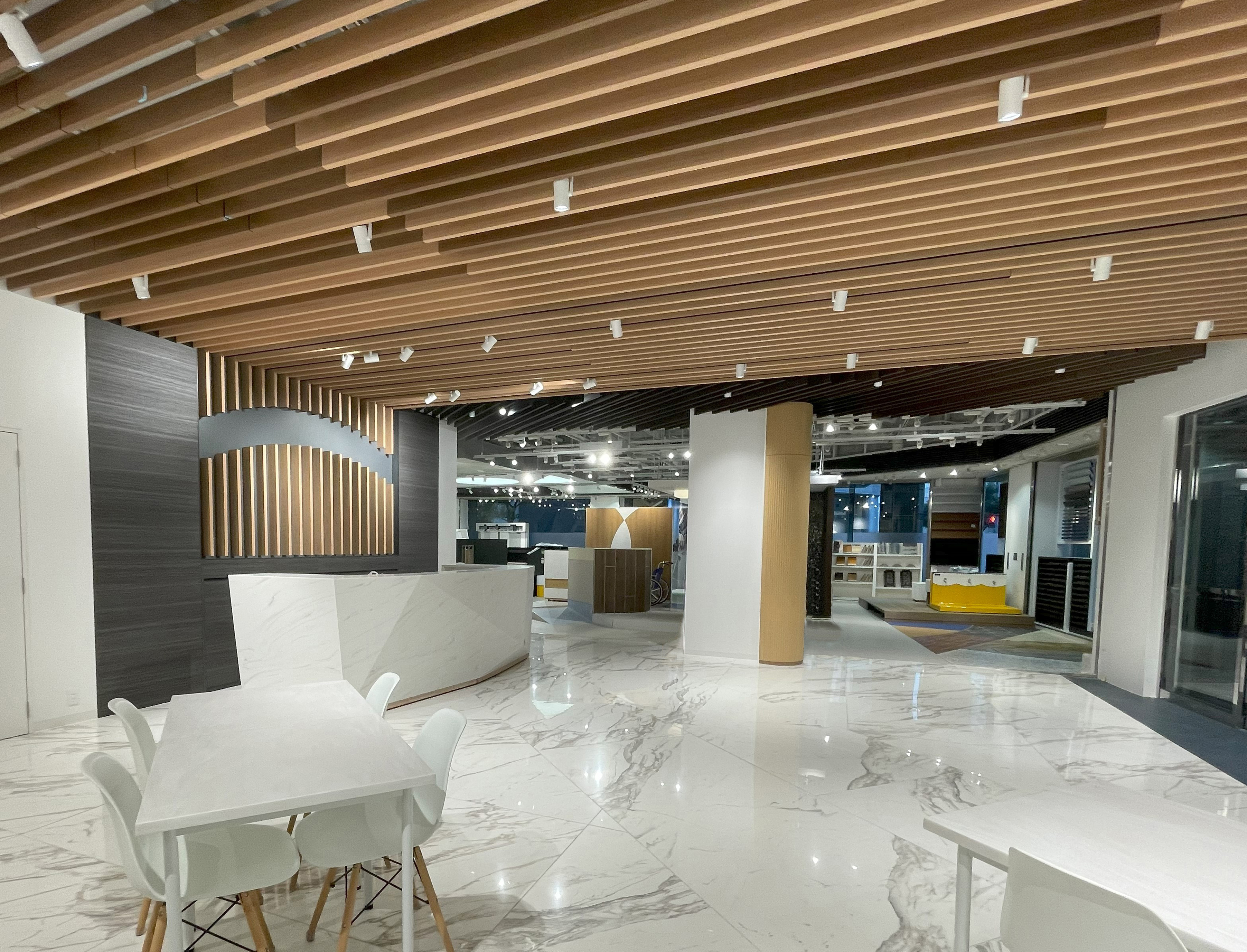 ショールーム内は「シーン展示」「サンプルライブラリー」「検証エリア」「商談エリア」の、大きく4つのエリアで構成されています。メインとなる「シーン展示」では、施設別に7つのシーンを想定した空間展示をご用意。床・壁・天井などの使用イメージが再現されているだけでなく、おすすめ商品の使い方や端部の納まりなども確認可能です。そのほか、採用現場に近い色温度で素材を確認することができる「検証エリア」や、お客さまが自由にご利用いただけるワークスペースも新設しました。