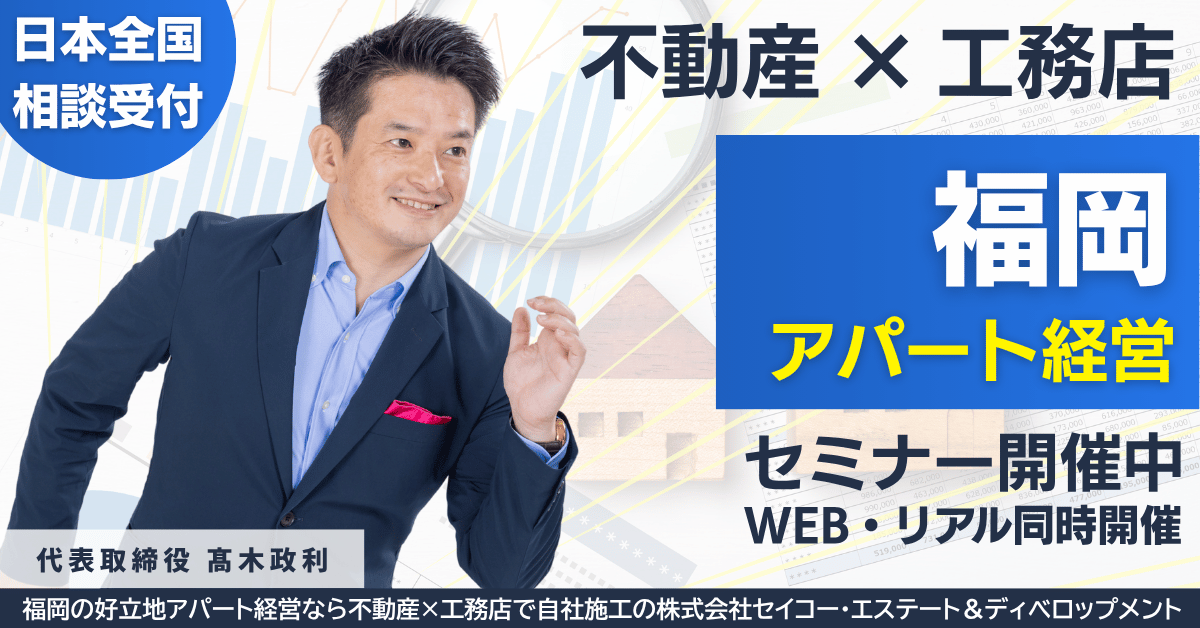 株式会社セイコー・エステート&ディベロップメントは、福岡市博多区を拠点に不動産投資支援と建築事業を展開しています。土地仕入れから融資戦略、建築プラン、施工、入居者管理までをワンストップで提供し、投資家の資産形成を伴走型で支援することを理念としています。福岡エリアでの不動産投資において、「投資家目線に立ったアパート建築会社」として、多くの投資家から高い信頼をいただいております。