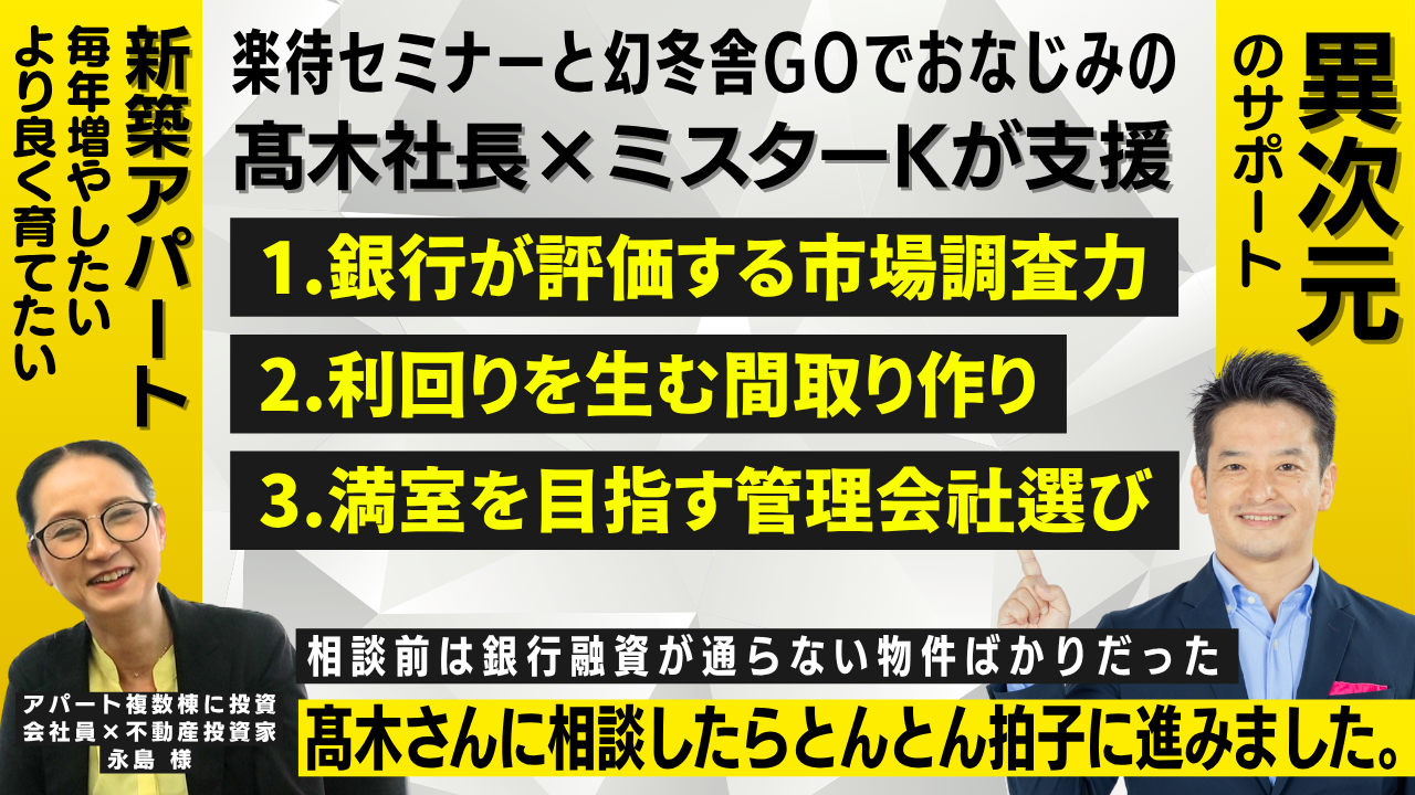 株式会社セイコー・エステート&ディベロップメント(本社:福岡市)は、様々な物件を持ち込んだが銀行融資を断られ続けた会社員・女性不動産投資家の永島様が、当社の1から10まで伴走する不動産投資サポートにより新築アパート一棟投資を成功されたことをお知らせします。会社員でありながら不動産投資に初めて踏み込んだ時の思いから、不動産投資の途中で苦労した話、セイコー・エステート&ディベロップメント代表髙木や当社のセミナー講師としても登壇するサラリーマン不動産投資家ミスターKとの出会い、そして銀行融資で評価されて無事に福岡の新築アパート一棟投資に成功するまでのストーリーを収めたインタビュー動画と記事を公開しました。