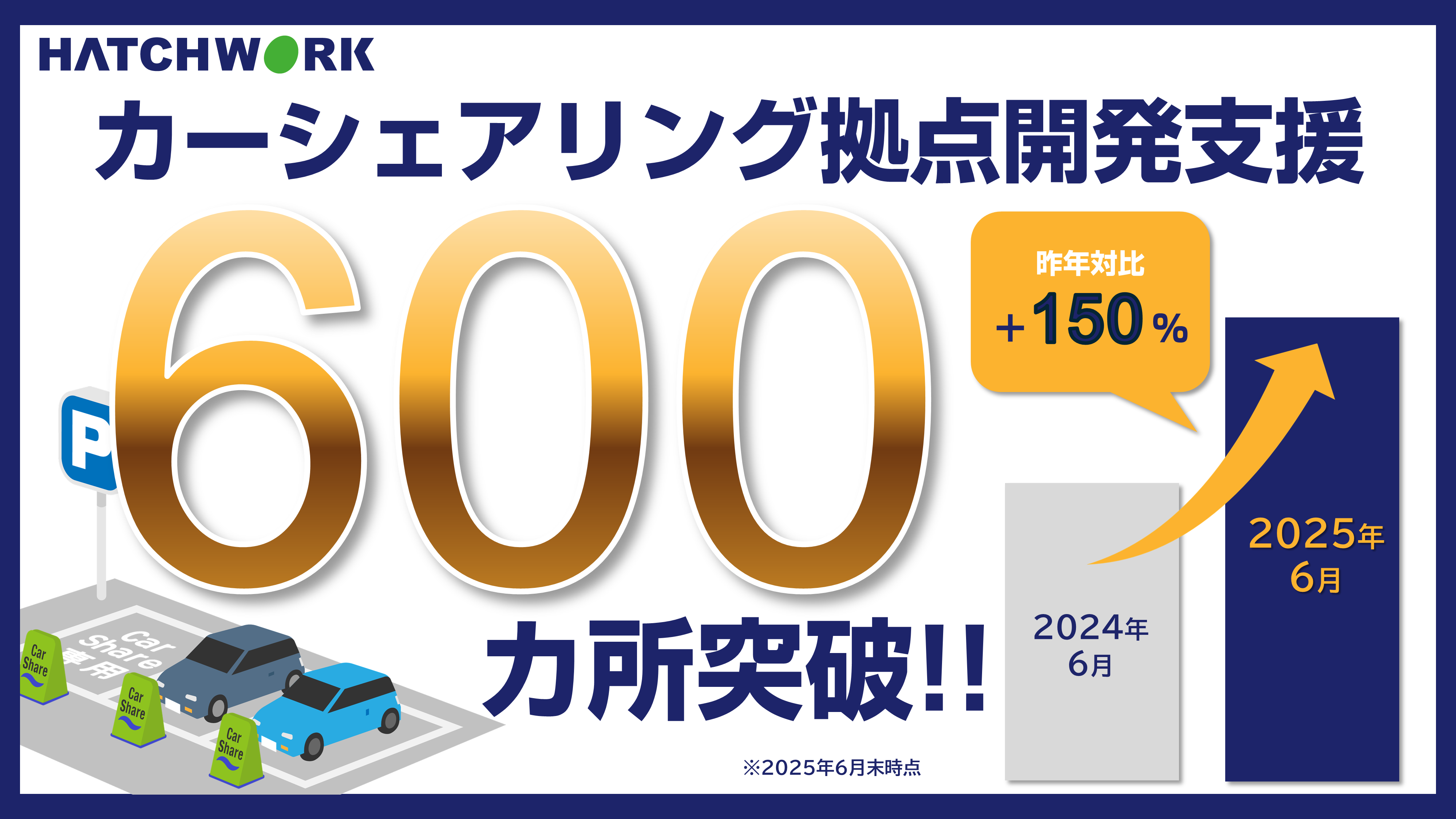 株式会社ハッチ・ワーク(本社:東京都港区、代表取締役社長:増田知平、以下「ハッチ・ワーク」)は、月極駐車場に新たな価値を生み出す取り組みとして進めているカーシェアリング事業者の拠点開発支援において、このたび累計実績が600カ所を突破したことをお知らせします。これは、2024年6月末時点の400カ所から150%増となり、順調に拡大を続けています。