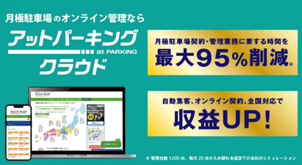 「アットパーキングクラウド」は、月極駐車場の管理業務を最大95%(※)削減し、高い集客力で稼働率を向上させる管理会社向けの月極駐車場オンライン管理支援サービスです。