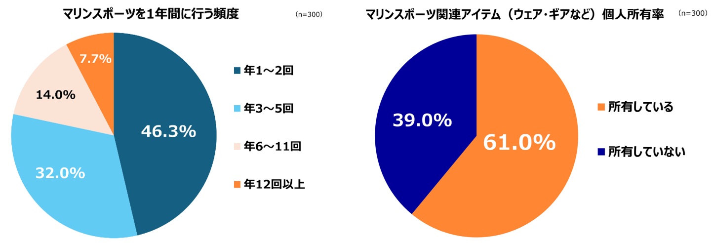 ◆マリンスポーツを行う頻度は年1~2回との回答が最多、6割以上がマリンスポーツ関連アイテムを所有