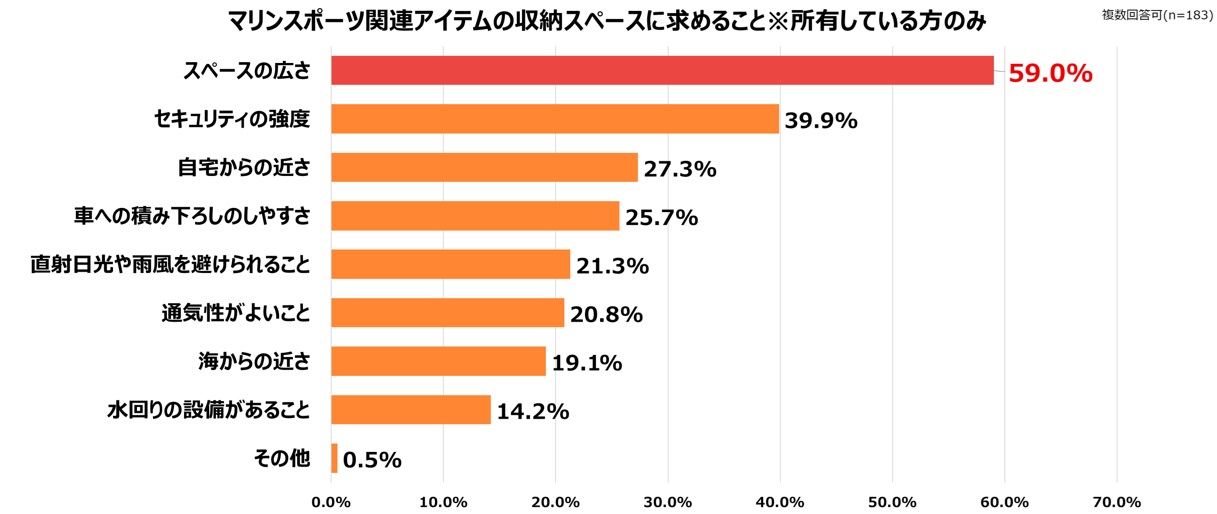 マリンスポーツに関するグッズを「所持している」方に、収納スペースに求めるものを尋ねたところ、最も多かったのは「スペースの広さ」で59.0%を占めました。次いで、「セキュリティの強度」(39.9%)、「自宅からの近さ」(27.3%)という結果になりました。そのほか、「車への積み下ろしのしやすさ」(25.7%)、「直射日光や雨風を避けられること」(21.3%)という結果になりました。