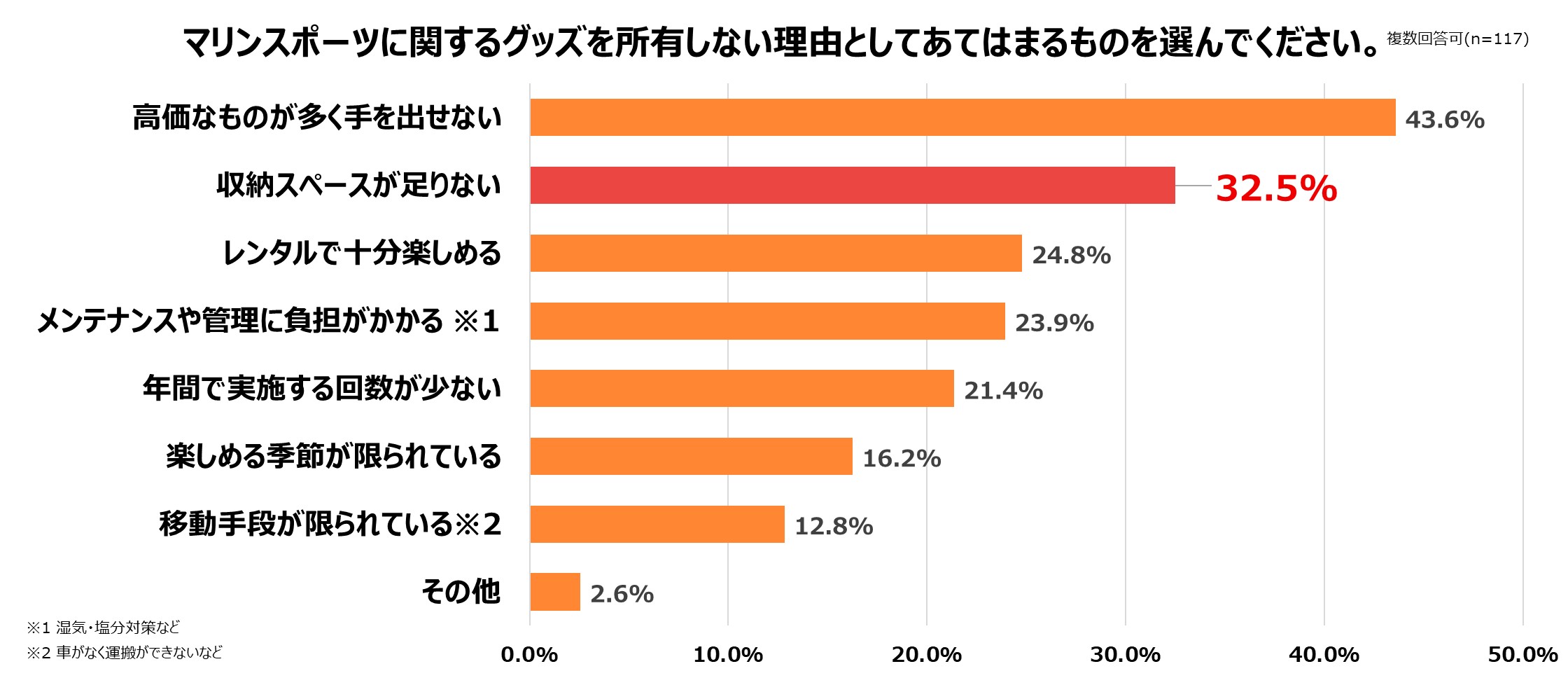 特に価格と収納がマリンスポーツ関連アイテムの自己所有を検討する際にネックとなっていることがわかりました。