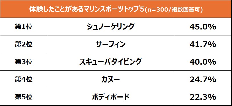 年に1回以上の頻度でマリンスポーツを実施している方を対象に、体験したことがあるマリンスポーツを尋ねたところ、第1位は、「シュノーケリング」(45.0%)、次いで第2位は「サーフィン」(41.7%)、第3位は「スキューバダイビング」(40.0%)、第4位は「カヌー」(24.7%)、第5位は「ボディボード」(22.3%)という結果になりました。