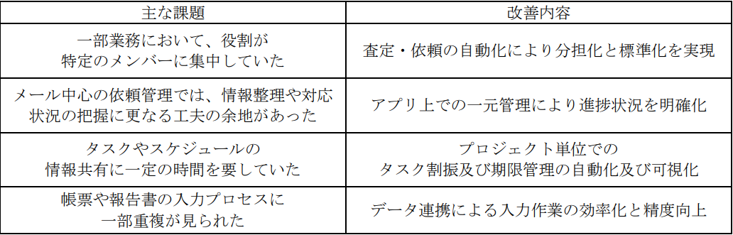 これまで、開発部門では業務が多岐にわたり、それぞれが専門的な知識を要するため、情報共有や連携においてさらなる効率化の余地がありました。2025年5月より開発部門で本格的に運用を開始した本クラウドサービス「kintone」により、従来の紙やメール中心の業務プロセスをデジタル化し、依頼や進捗管理、報告業務を一元化。その結果、6月末時点の実績では、当該部門で一人あたり月間8.1時間、部門全体で月間約80時間の作業時間削減を実現しました。
