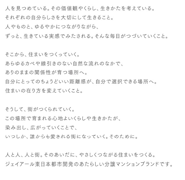 単なる居住空間としての住まいではなく、人と街、人と人がやさしくつながる場所としての住まいである「やがて、街になる住まい」というブランドコンセプトを設計に反映します。