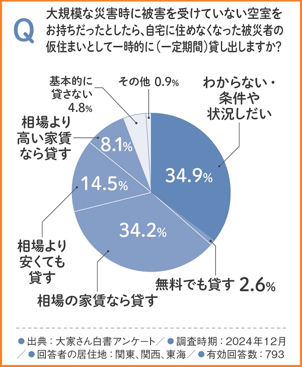 さらに、「わからない・条件や状況しだい」と回答した34.9%を含めると、9割以上の大家さんが被災者への住まい提供に前向きな姿勢を示していることになります。これは、大家さんの持つ高い社会貢献への意欲を明確に示しています。