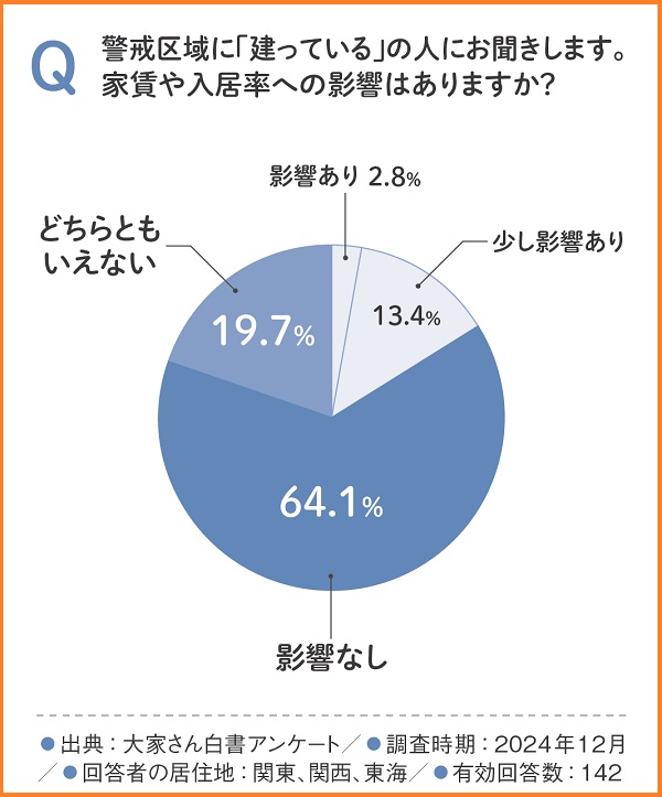 しかし、警戒区域内に物件があることによる家賃や入居率への影響については、64.1%の大家さんが「影響なし」と回答しており、実際の賃貸市場への影響は限定的であると認識されています。