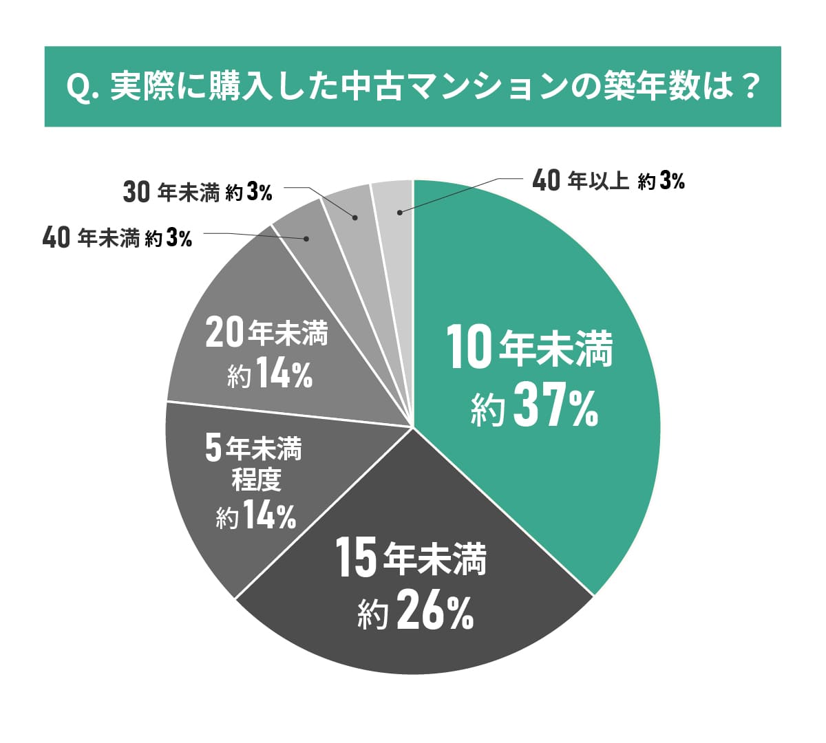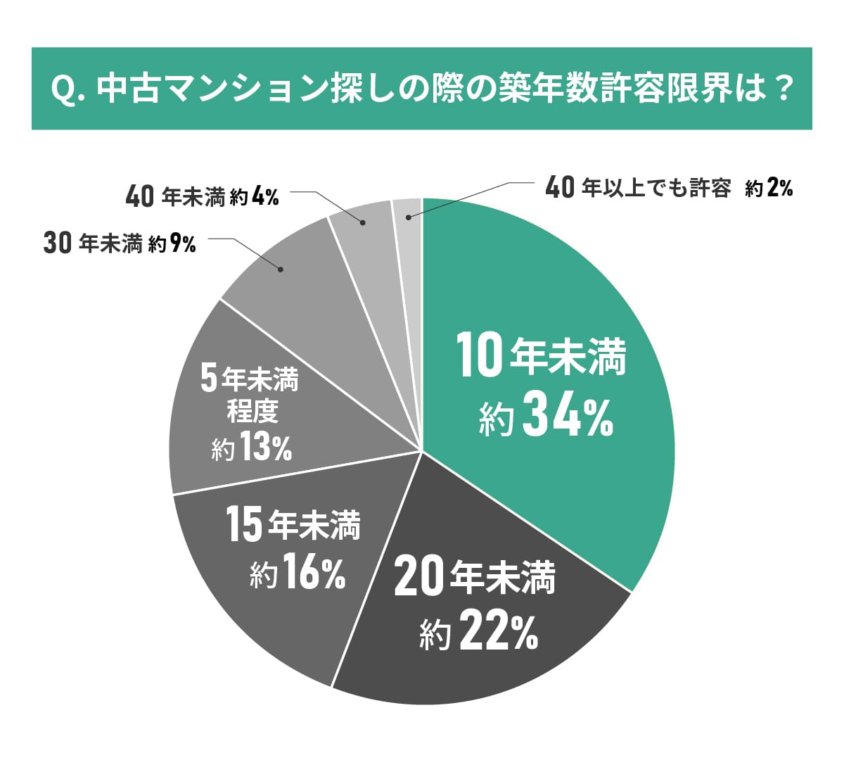最も多いのは「10年未満」で全体の約34%を占めています。築15年未満までを含めると全体の約72%に達し、多くの購入者が比較的新しい物件を求めていることが明らかです。一方で、築40年以上でも許容する購入者は約2%にとどまり、古い物件への需要は限定的です。