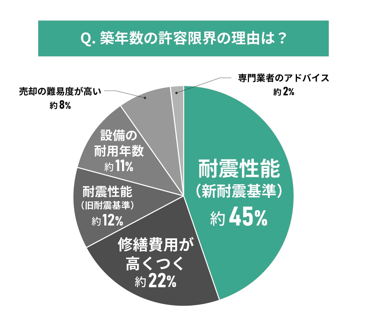耐震性能を重視する回答者が全体の約57%(新旧基準合計)に達し、安全性への関心の高さが際立っています。修繕費用への懸念も約22%と高く、長期的な維持コストを重視する傾向が見られます。