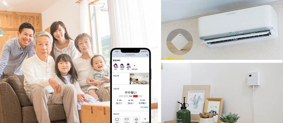 高齢の方は、エアコンをつけたがらない傾向があります。一人暮らしの高齢の親御さまのお家にMANOMAを設置し、28℃を超えたら冷房がつくように設定。もし消されてしまっていても、アプリで温湿度をチェックしたり、映像でエアコンがついているかを確認したりして、都度手動で操作することも可能です。