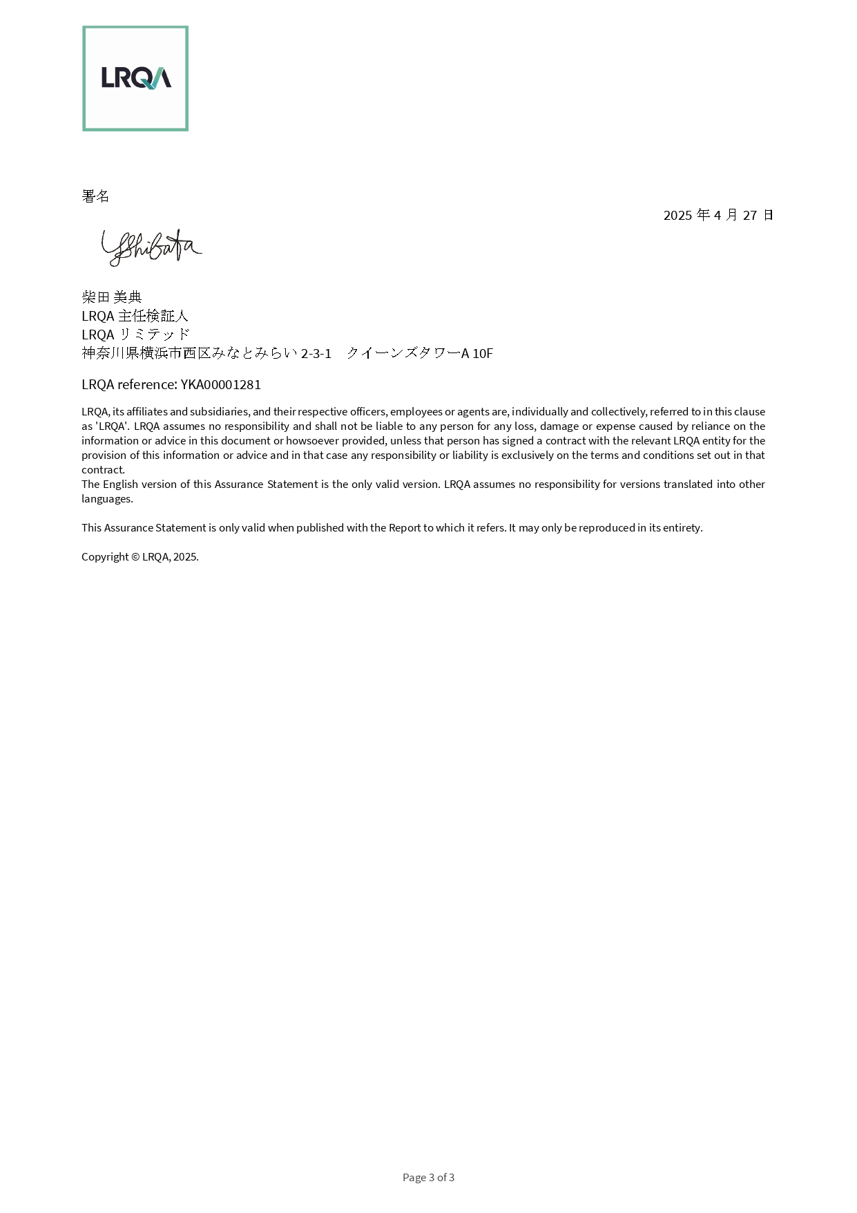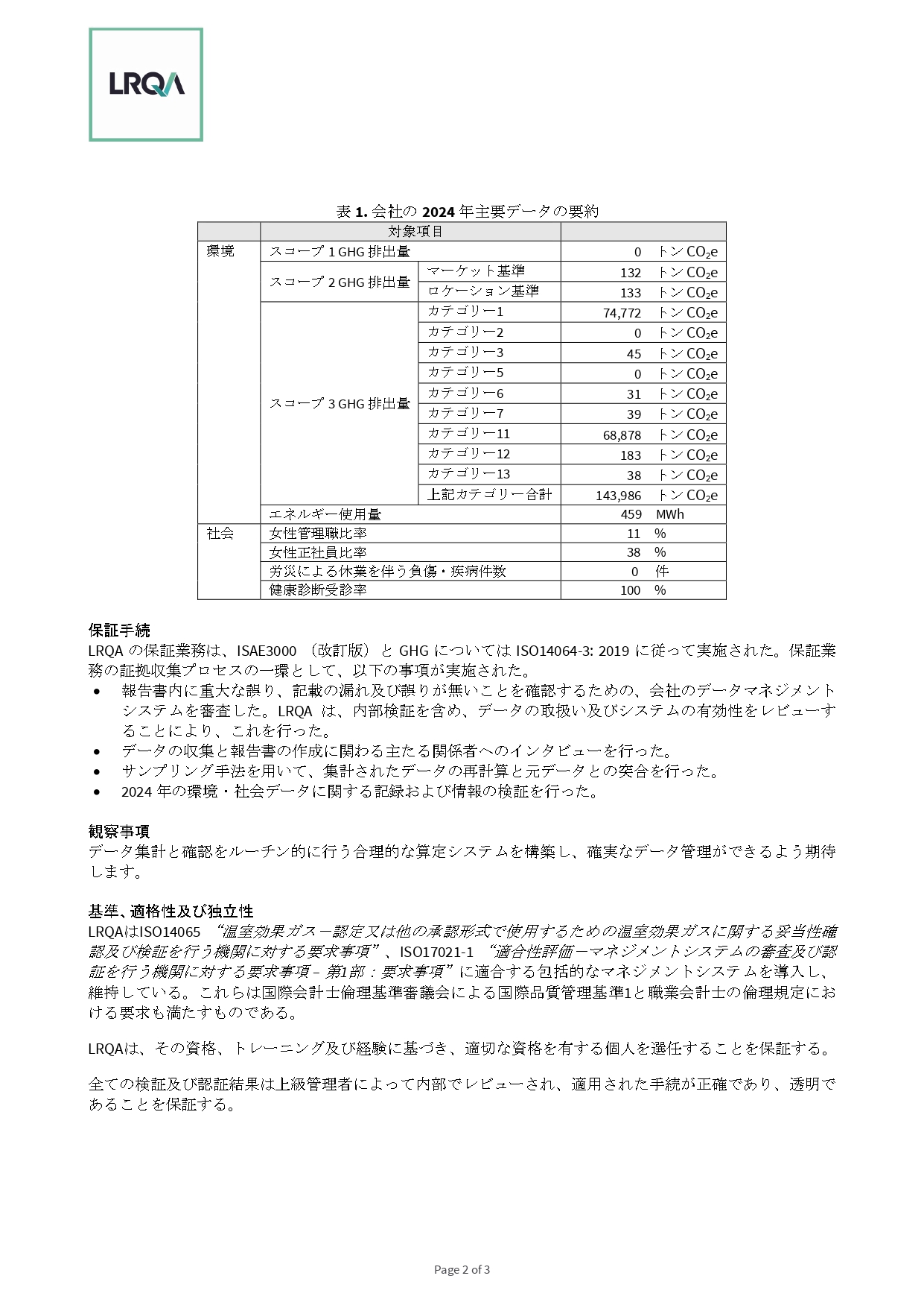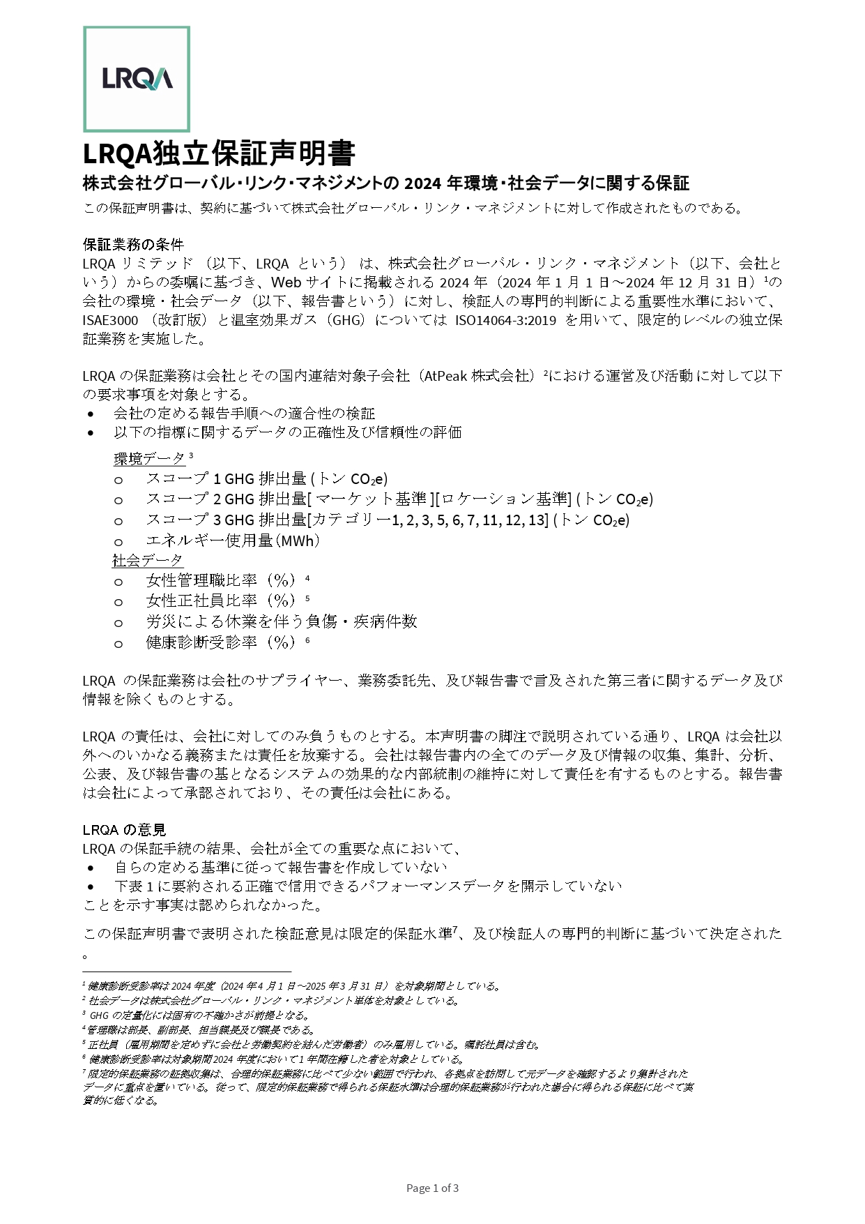 GLMは、当社等WEBサイト※1において2024年1月1日から12月31日※2までの期間に掲載された環境・社会データに対し、ISAE3000(改訂版)およびISO14064-3:2019に基づく第三者検証を実施し、検証機関であるLRQAリミテッドより独立保証声明書を取得しました。