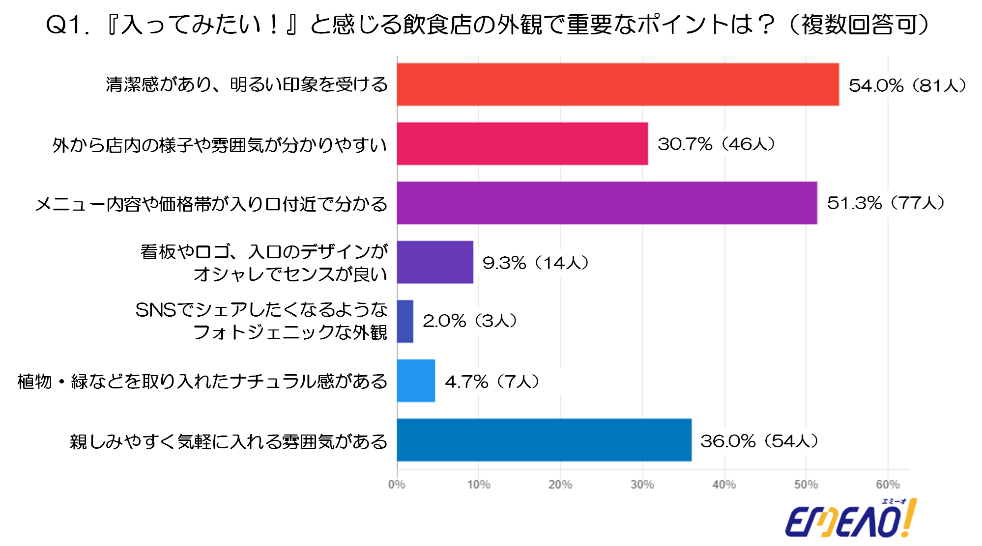 • 次いで「メニュー内容や価格帯が入り口付近で分かる」(51.3%・77人)、「親しみやすく気軽に入れる雰囲気がある」(36.0%・54人)、「外から店内の様子や雰囲気が分かりやすい」(30.7%・46人)も高い割合となっており、“分かりやすさ”や“入りやすさ”が重要視されている傾向が読み取れます。