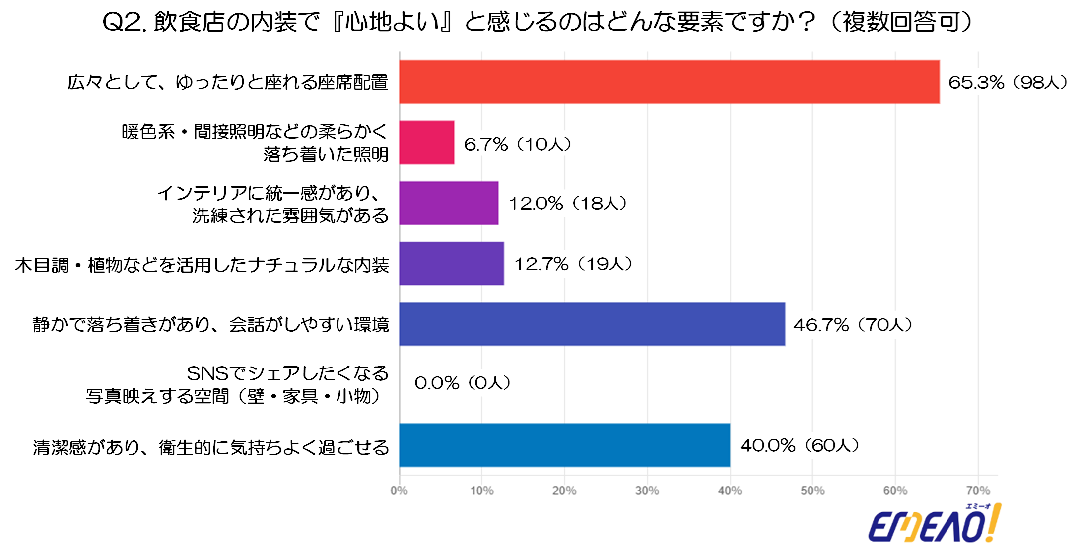 • 次いで「静かで落ち着きがあり、会話がしやすい環境」(46.7%・70人)や「清潔感があり、衛生的に気持ちよく過ごせる」(40.0%・60人)も高い割合となっており、リラックスできる静けさや清潔さも快適さの重要なポイントであることが読み取れます。