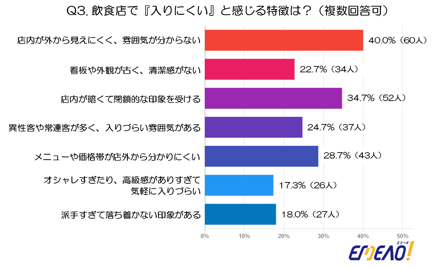 • 最も多かったのは「店内が外から見えにくく、雰囲気が分からない」(40.0%・60人)で、外から店内の様子が見えないことが“心理的なハードル”になっていることが分かります。