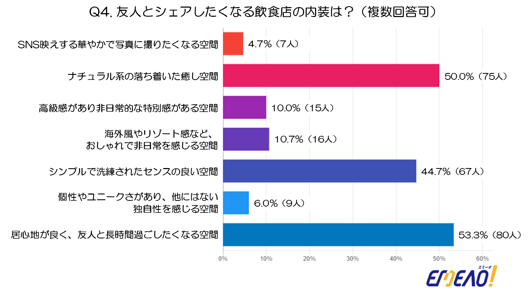 • 「海外風やリゾート感など、おしゃれで非日常を感じる空間」(10.7%・16人)や「高級感があり非日常的な特別感がある空間」(10.0%・15人)、「個性やユニークさがあり、他にはない独自性を感じる空間」(6.0%・9人)、「SNS映えする華やかで写真に撮りたくなる空間」(4.7%・7人)はいずれも少数派となっており、非日常感やインパクト、写真映えよりも、落ち着きや癒し・居心地の良さが友人とシェアしたくなる飲食店のポイントであることが読み取れます。
