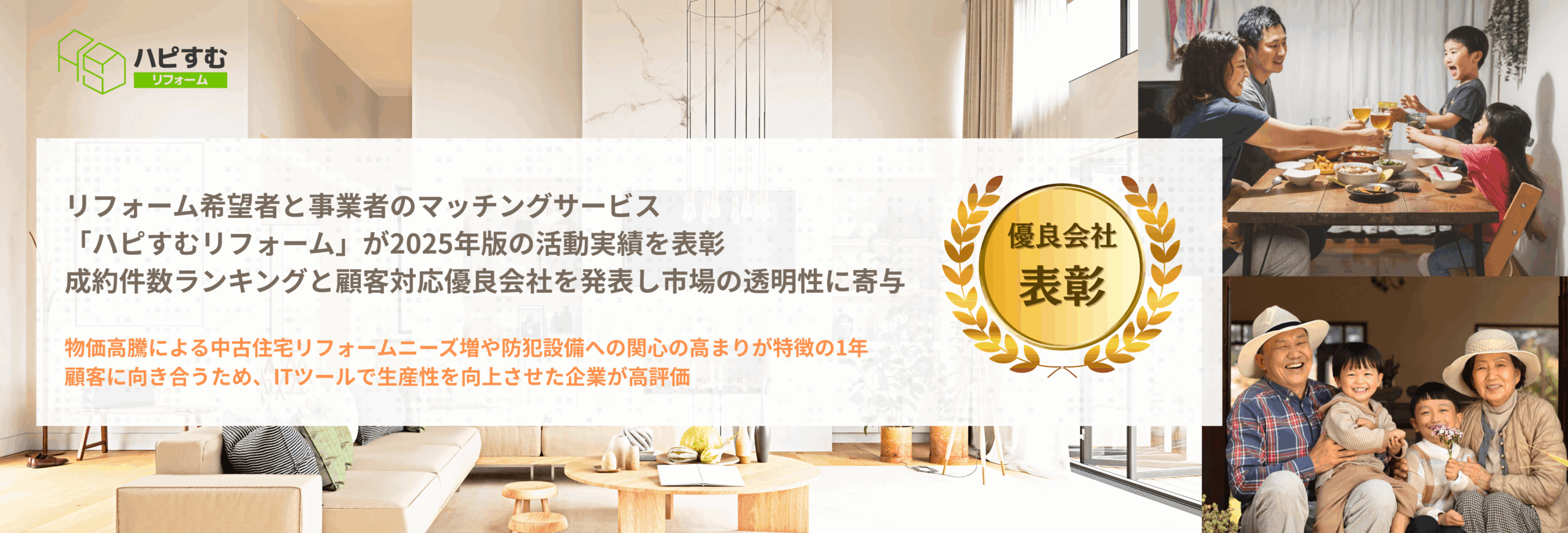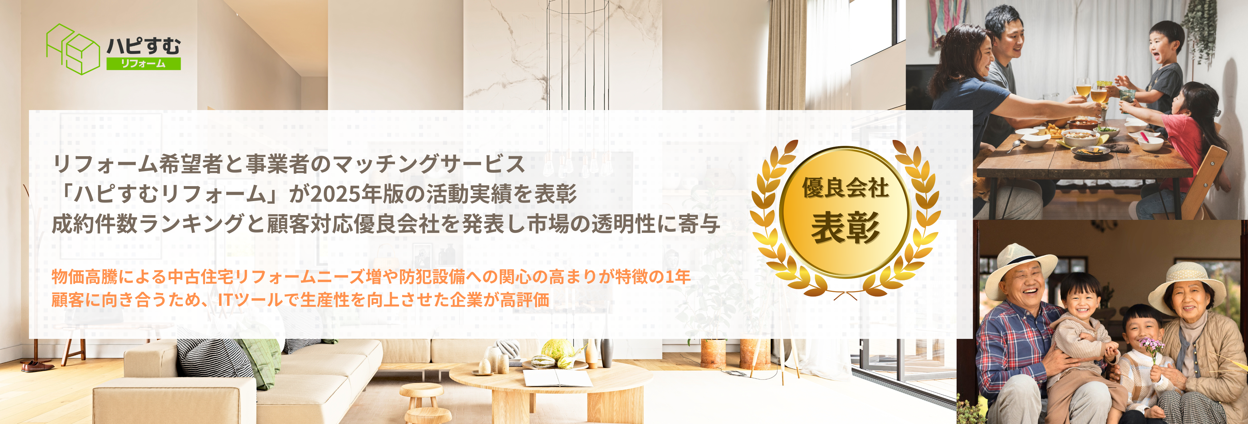 株式会社エス・エム・エス(本社:東京都港区、代表取締役社長:後藤夏樹、東証プライム、以下「当社」)が提供するリフォーム希望者と事業者のマッチングサービス「ハピすむリフォーム」(URL:https://hapisumu.jp/)において、加盟リフォーム会社の年間実績を讃える「ハピすむリフォーム活動実績表彰制度」の2025年版部門別表彰を実施したことをお知らせします。