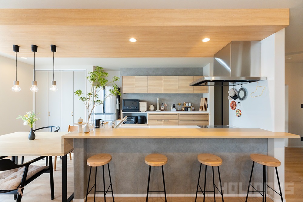 お酒やティータイムを愉しむことができる造作カウンターをキッチン前に設置。料理をしながらでも対面で会話ができます。またカウンターはダイニングまで一体で成形しているような造りになっているため空間にまとまりがでています。木目で合わせつつ一部を折り下げ天井とすることで非日常感のある空間に仕上げました。