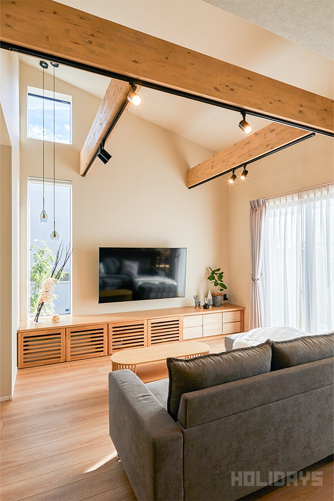 25畳の広々LDKには梁がアクセントになった吹き抜けを設計。ロフトに繋がる階段にはアイアン手摺+ひな壇階段を採用することで視線が抜け、より広い空間に見えるよう演出。開放感のある間取りは家全体の空調を管理できる全館空調を搭載しているからこそです。快適な空間をぜひ体験しに来てください。
