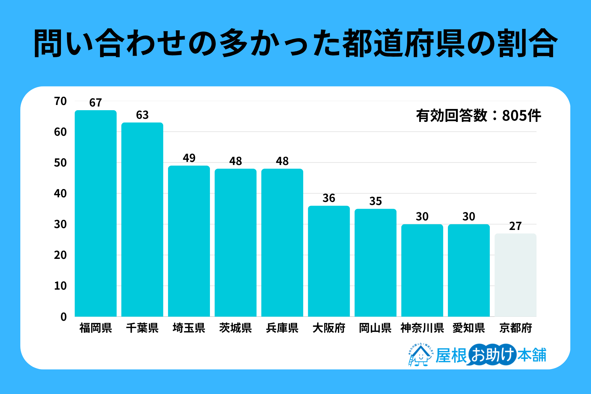 被害状況を具体的に記載して問い合わせを行った805件の相談データを都道府県別に集計した結果、もっとも多かったのは福岡県(67件)でした。続いて千葉県(63件)、埼玉県(49件)、茨城県・兵庫県(各48件)という順になっています。