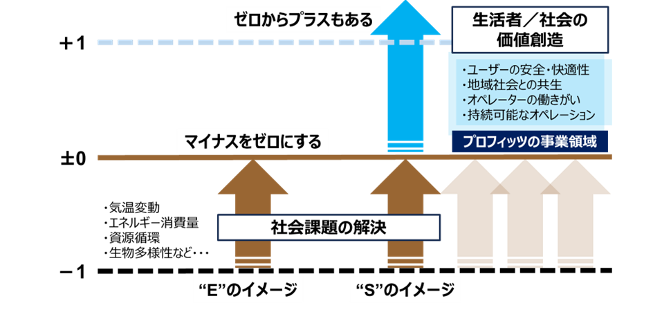 また、これらのプラスの価値を着実に実装していくことは、長期的には社会のマイナスの課題を減らすことにも貢献します。マイナスをゼロに戻す活動と、ゼロからプラスの新たな価値を創出する取り組みは、いずれも“S(社会)”を構成する両輪です。この考えのもと、プロフィッツはESG投資の新しい価値の形を模索しながら、不動産を通じて生活者一人ひとりと社会との接点を再設計しています。