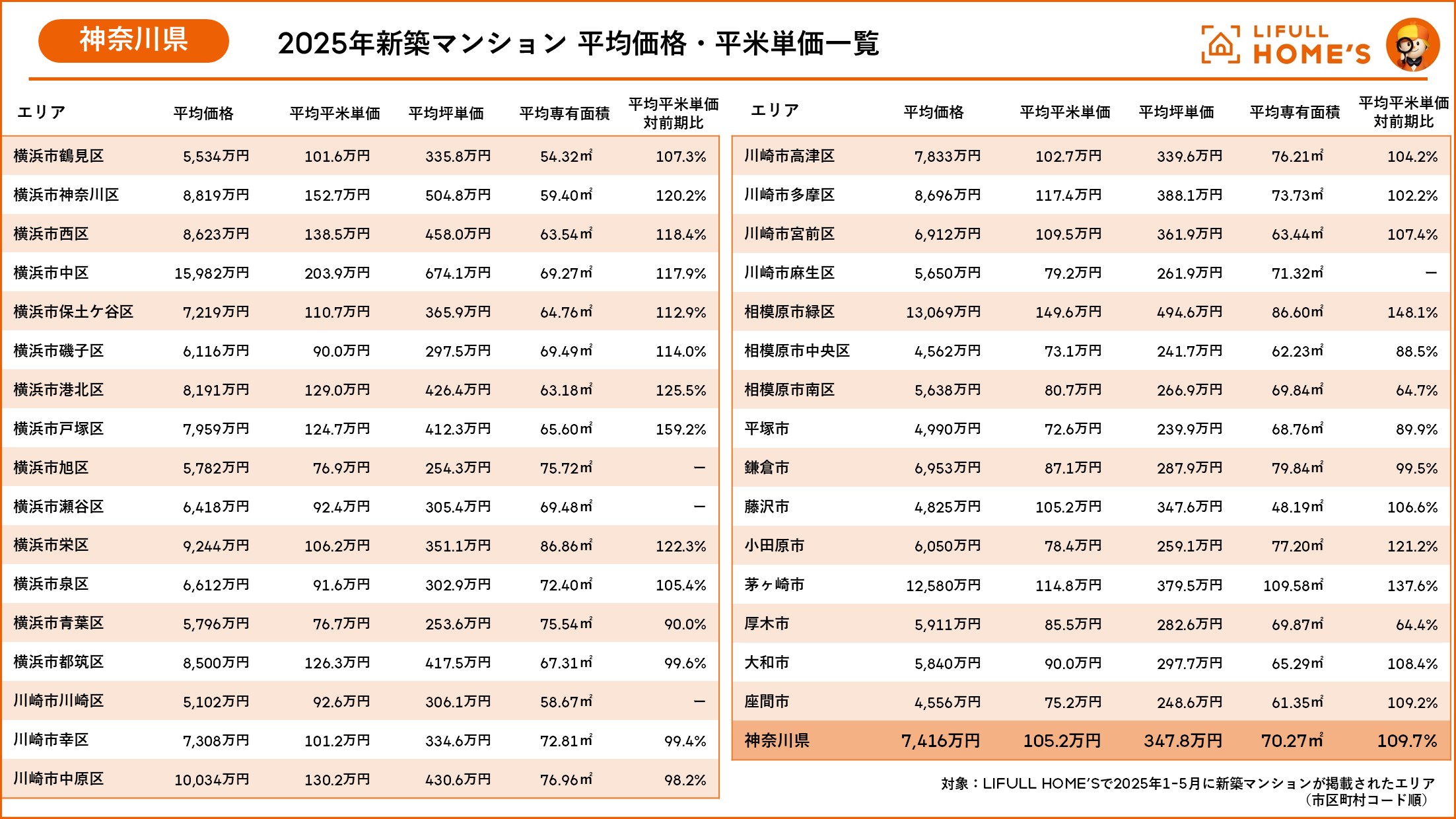 2025年1-5月に掲載した神奈川県の新築マンションは32エリアあり、平均平米単価は104.6万円と100万円を超え、前期比109.1%と昨年よりも上昇しています。平均価格が最も高いエリアは1億5,982万円の横浜市中区、2位は相模原市緑区の1億3,069万円、3位は茅ヶ崎市の1億2,580万円となりました。川崎市幸区も1億円を超え、神奈川県内の4エリアが億超えエリアです。平均平米単価の上昇率は、横浜市戸塚区(159.2%)が最も高くなりました。相模原市緑区(148.1%)、茅ヶ崎市(137.6%)が続き、この2エリアは平米単価が上昇したことで平均価格が上昇したとみられます。