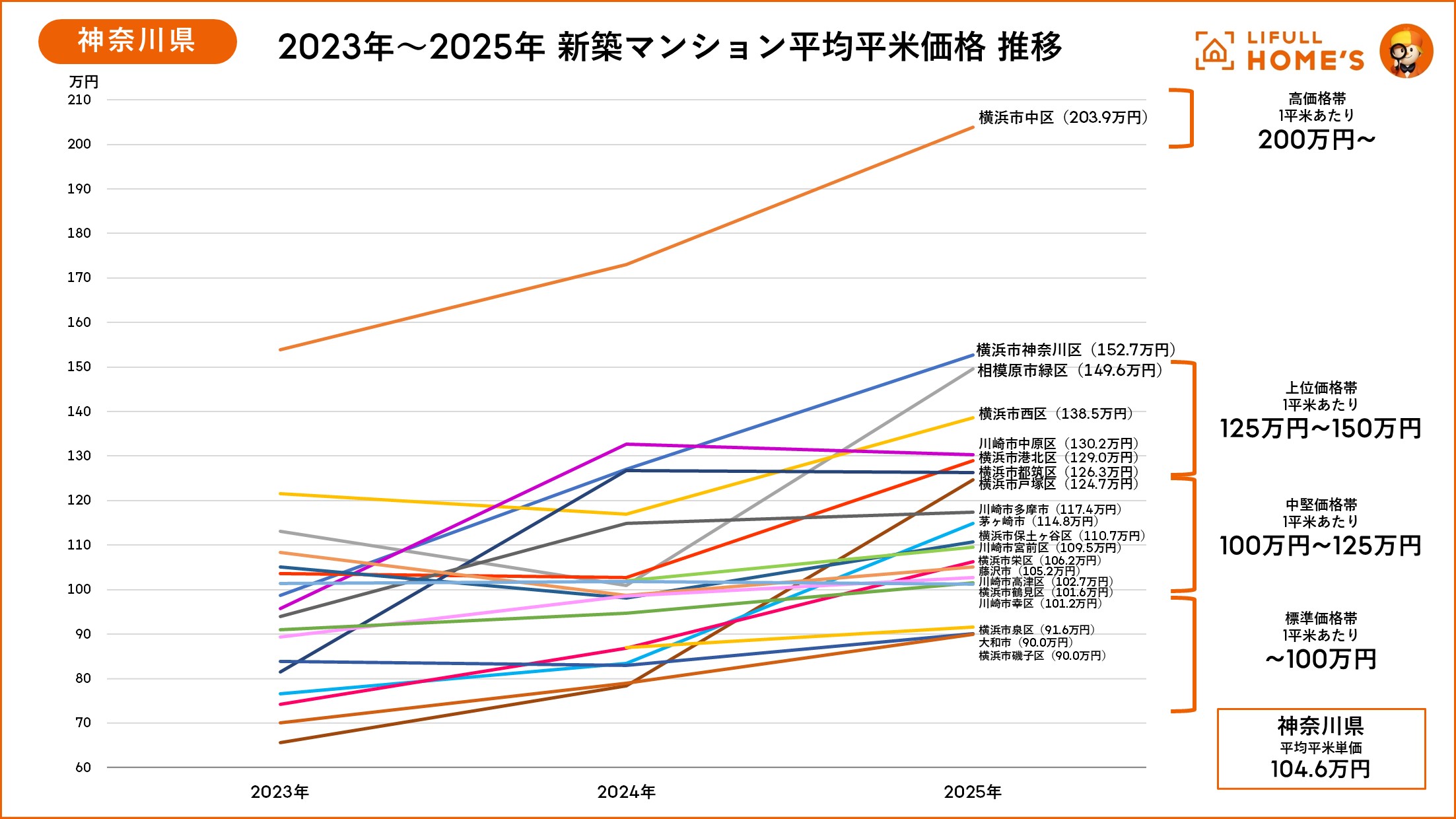 2025年の東京23区の平均平米単価は207.4万円と突出して高額ですが、神奈川県でも同105.2万円と100万円を突破し、千葉県85.2万円、埼玉県80.4万円と前年から概ね10%前後の明らかな価格の押し上げが発生しています。