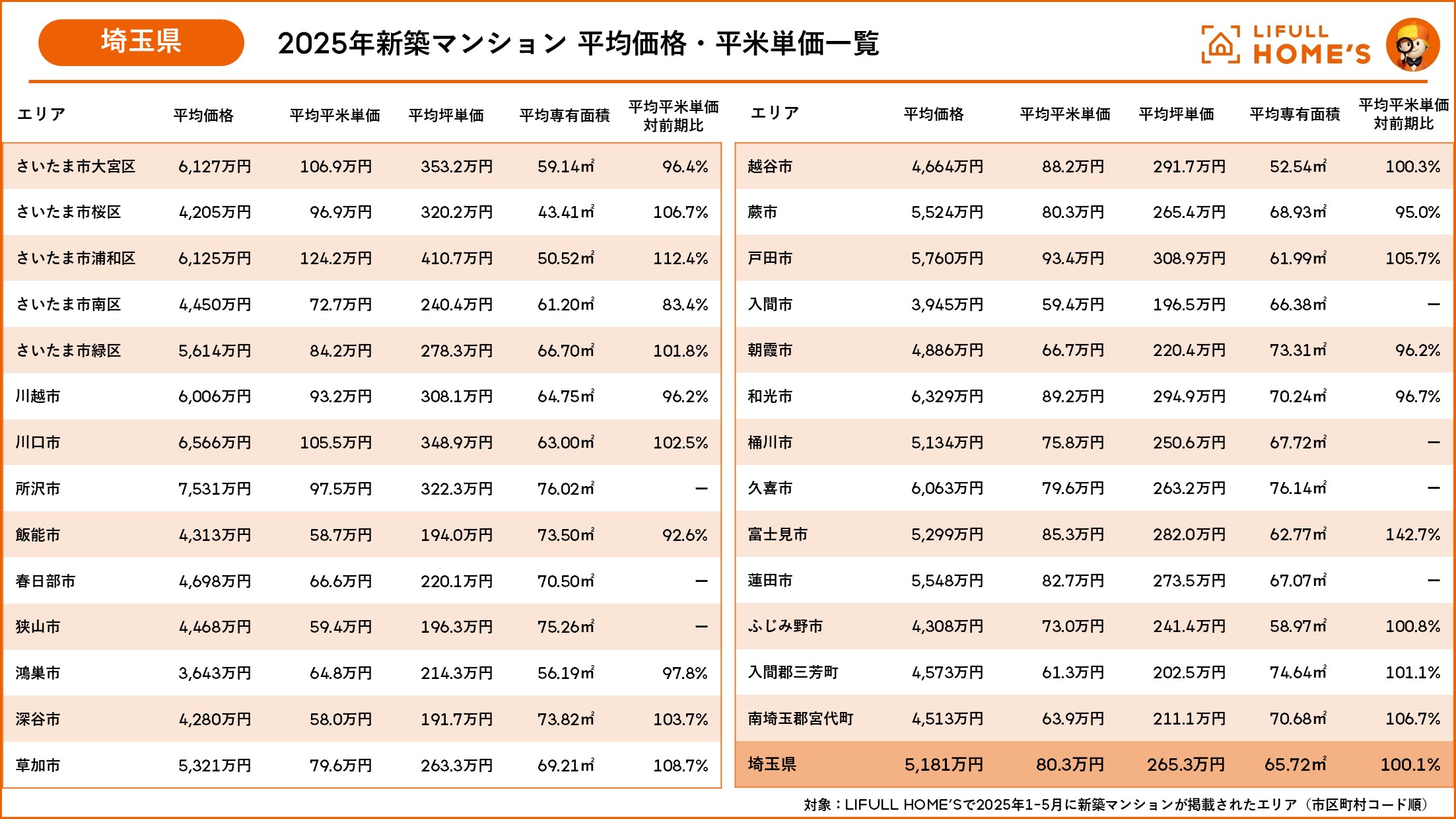 2025年1-5月に掲載した埼玉県の新築マンションは27エリアあり、平均平米単価は80.3万円、前期比100.1%です。最も平均平米単価が最も高いエリアはさいたま市浦和区(124.2万円)です。埼玉県内で「都心直結・ブランド性」のあるエリアとして平米単価が上昇しています。また、平均価格が最も高い所沢市は7,531万円で埼玉県内唯一の7,000万円台です。この他、県内の6,000万円台は6エリアでさいたま市大宮区、浦和区、川越市、川口市、和光市、久喜市です。