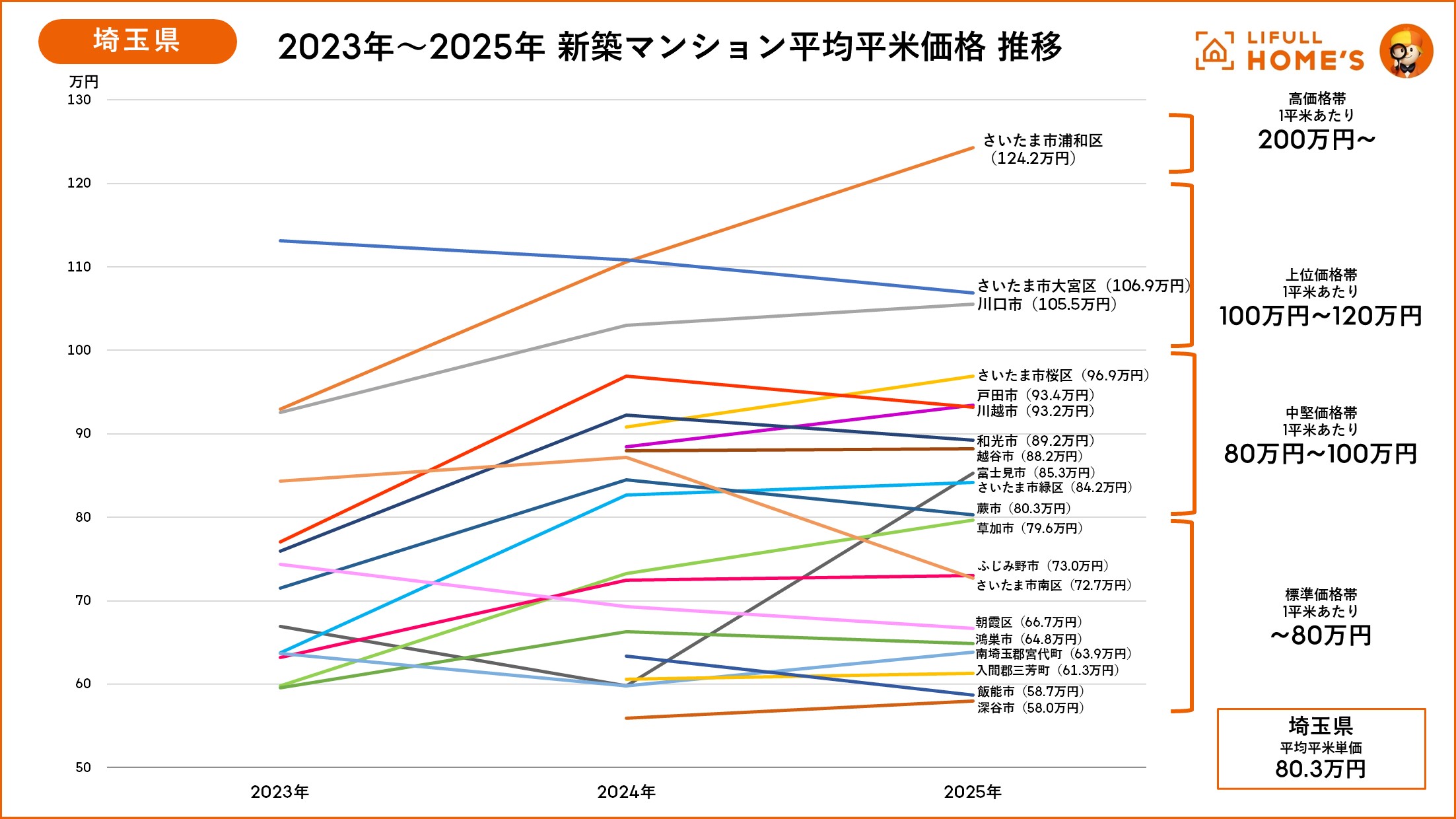 埼玉県で2024年に掲載があり且つ、2025年の平均平米単価上位20エリアについて2023年からの推移をみると、2025年時点で浦和区の平均平米単価が124.2万円に達し、東京23区内と同程度の価格帯に突入しました。さいたま市大宮区や川口市では平均平米単価が100万円を超えるなど、都心アクセス性の高いエリアを中心に価格の上昇傾向が顕著です。浦和区と飯能市・深谷市では1㎡あたりの価格差が2倍以上(約66万円の差)となり、同一県内でも居住地によって住宅価格の負担感が大きく異なっています。一方で、埼玉県は27エリアで新築マンションが供給されており、平均平米単価が60~80万円台の地域も多くあることから、価格面で「手が届くエリア」の選択肢が豊富ともいえます。