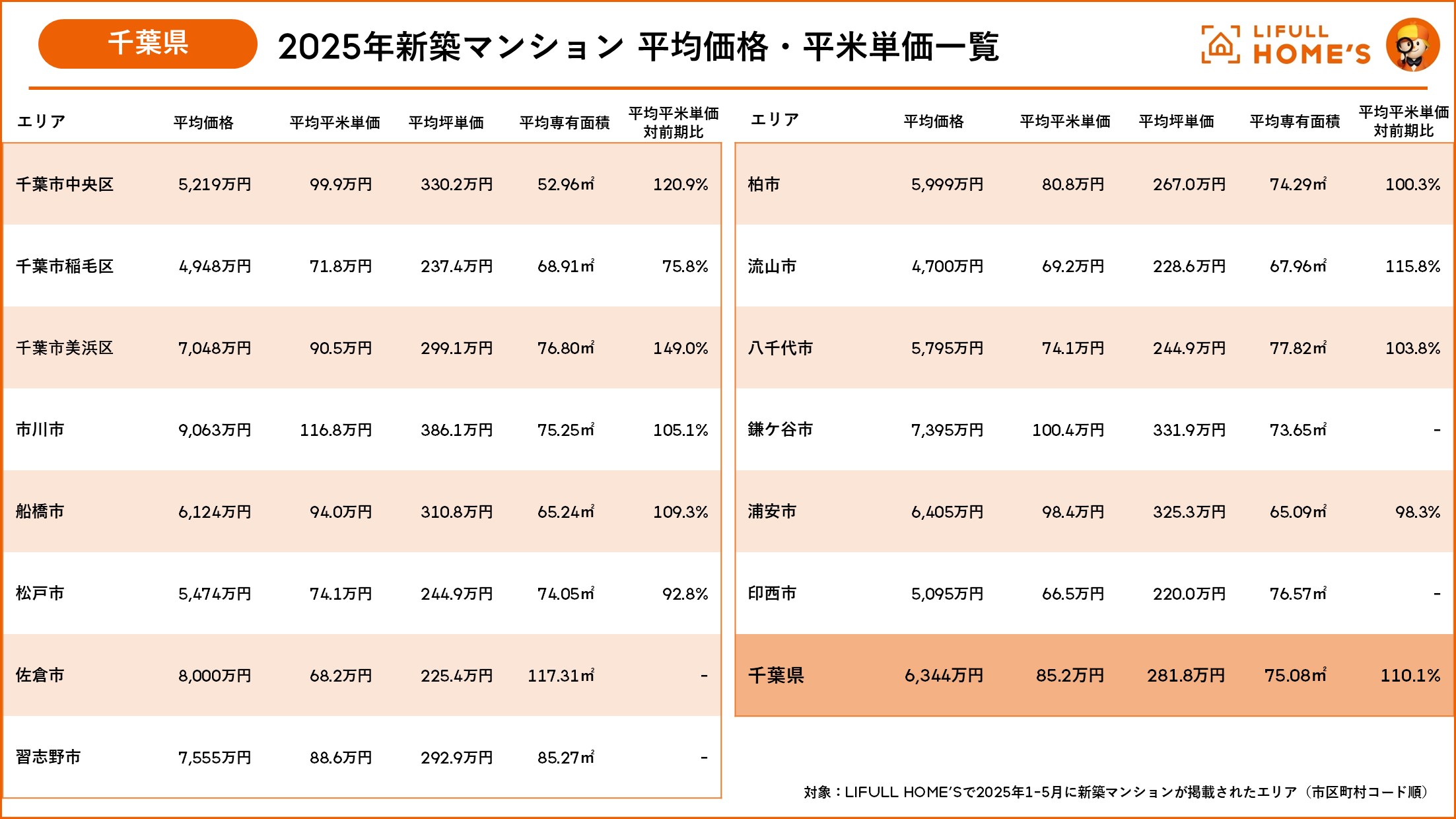 2025年1-5月に掲載した千葉県の新築マンションは14エリアあり、平均平米単価は85.2万円、前期比110.1%と昨年よりもさらに上昇しています。最も平均平米単価が最も高いエリアは市川市(116.8万円)で平均価格が最も高く9,000万円台です。東京都に隣接し、JR総武線や東京メトロ東西線、都営新宿線などが運行していることから利便性の高さが価格に反映されています。