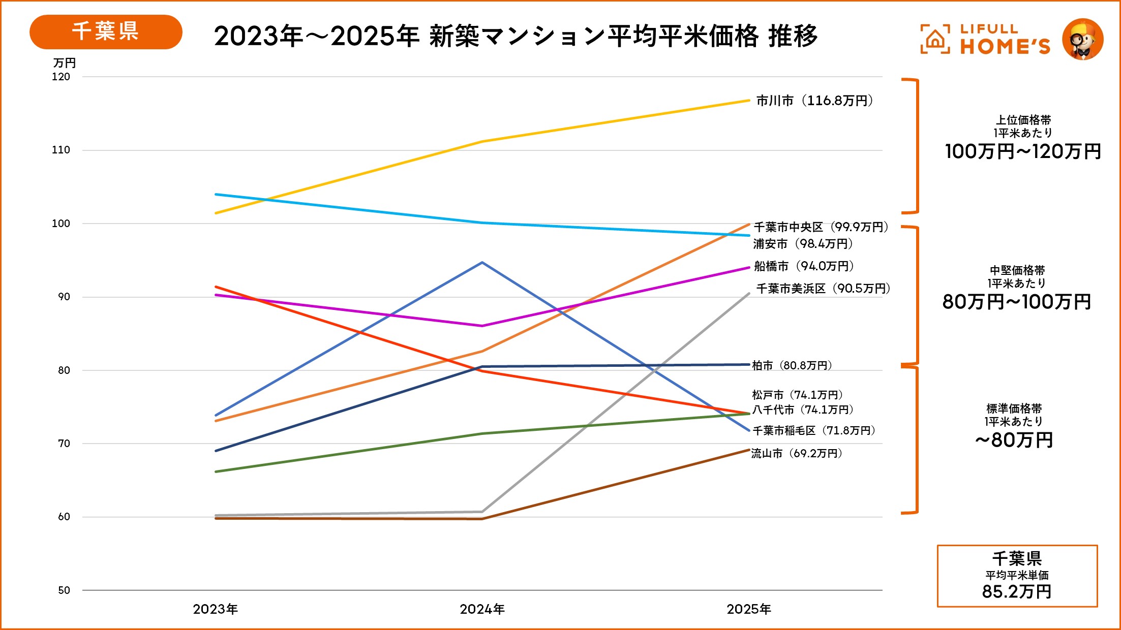 千葉県でも同様の傾向が示されていて、東京隣接の市川市で116.8万円、“千葉都民”が多く居住する浦安市でも98.4万円のほか、船橋市94.0万円、千葉市美浜区90.5万円など、単価100万円以下で購入可能なベッドタウンでのマンション開発が活性化しています。