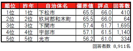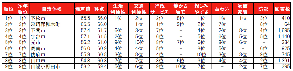 住みここち1位は6年連続で下松市。2位は3年連続で玖珂郡和木町。3位は4年連続で下関市。