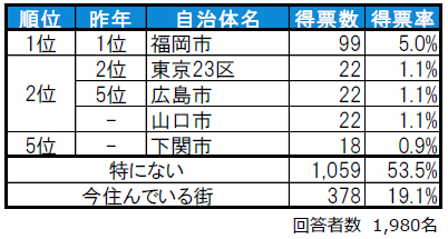 住みたい街の1位は5年連続で福岡市。2位は同率で東京23区(4年連続)・広島市・山口市。