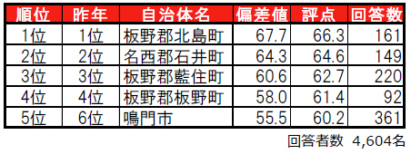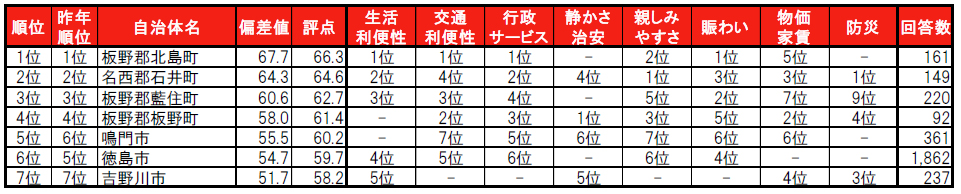 住みここちは3年連続で、1位板野郡北島町、2位名西郡石井町、3位板野郡藍住町。