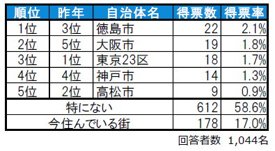 住みたい街は、1位徳島市、2位大阪市、3位東京23区。
