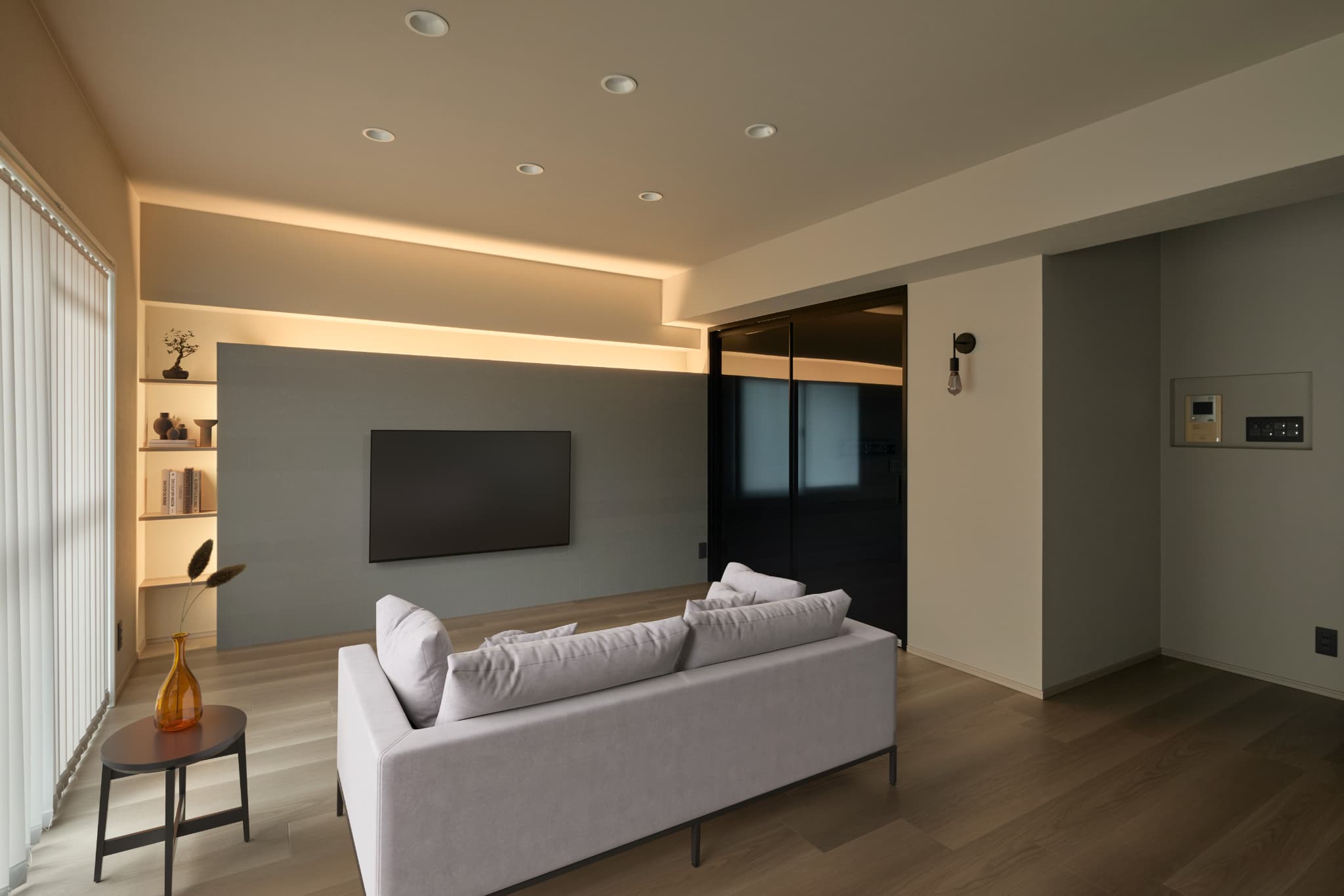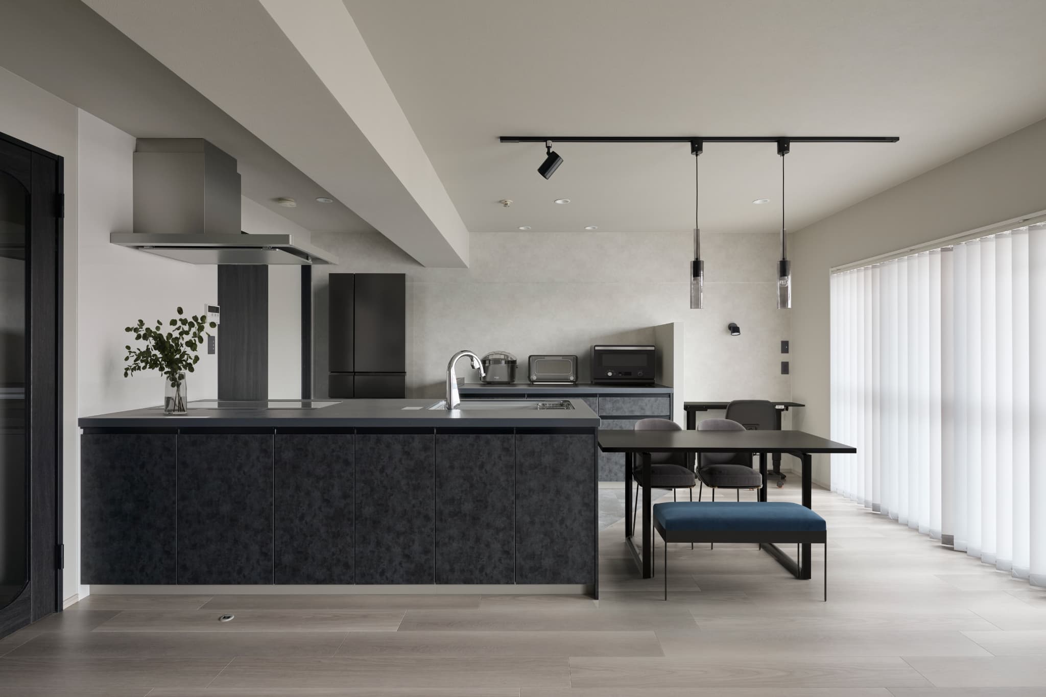 建具やキッチンに黒を取り入れ、全体を引き締めたホテルライクな空間。トーンを抑えたクロスや間接照明の使い方にもこだわり、上質さとあたたかさが両立した雰囲気に仕上げました。