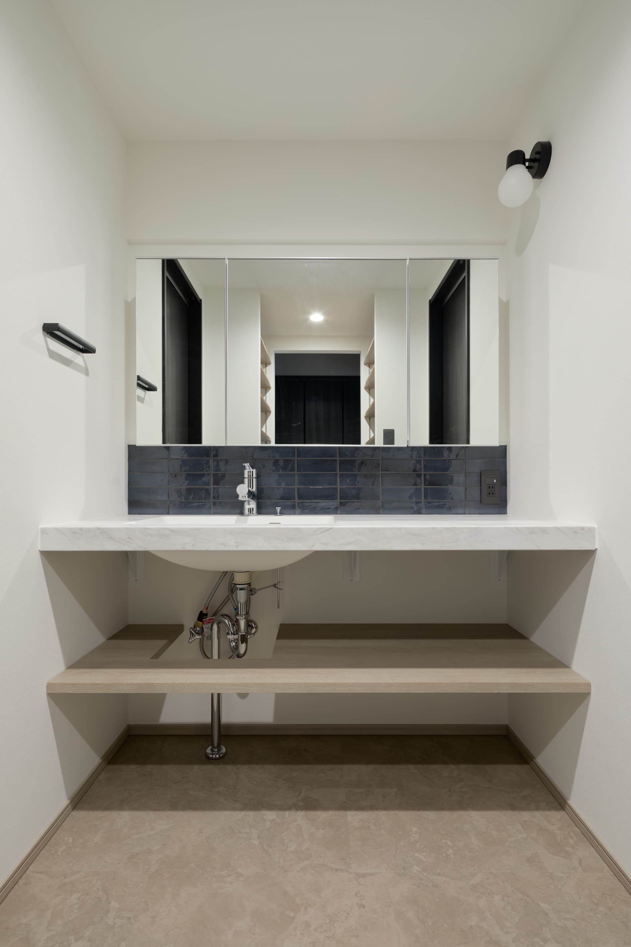 ■青タイルと波模様の灯りが彩る、遊び心あふれる水回り