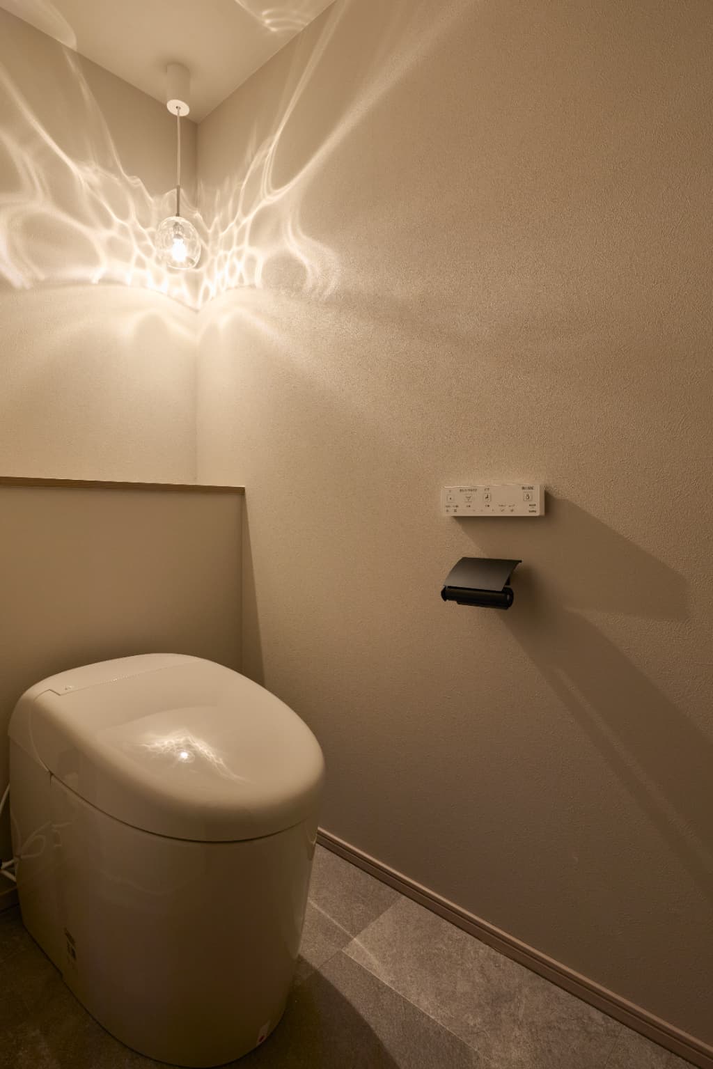 造作洗面に青いタイルを取り入れ、清潔感と遊び心をプラス。波模様の照明が灯るトイレも含め、水回り全体に「自分らしさ」を感じられる工夫が詰め込まれています。