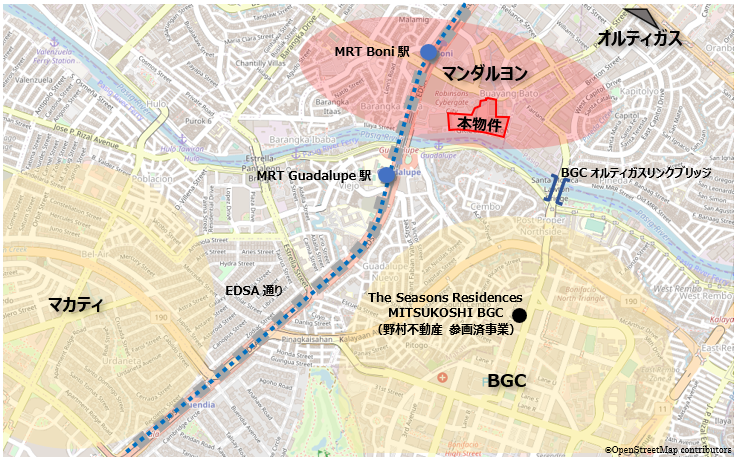 マンダルヨンは、フィリピンの首都圏であるメトロマニラのうち、主要都市エリア(BGC、マカティ、オルティガス)に囲まれた利便性の高いエリアです。主要幹線道路であるEDSA通りから至近の立地であることに加えBGCオルティガスリンクブリッジによりBGCへのアクセスが向上した交通利便性に優れて、周辺は職住近接を嗜好する若い世代の評価が高い地域でもあります。