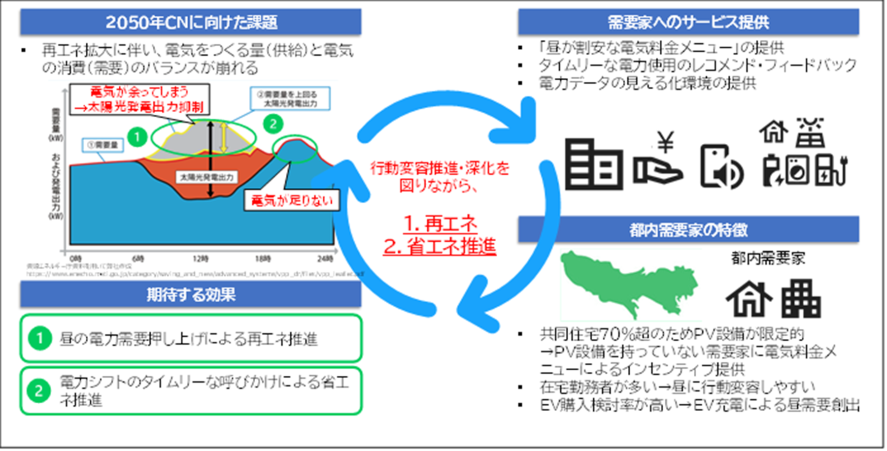 太陽光発電など再生可能エネルギーの供給が最大となる昼に割安な電気料金メニューを設定するほか、昼の電力使用や買取電力量に応じたインセンティブを提供することで昼の電力需要を創出