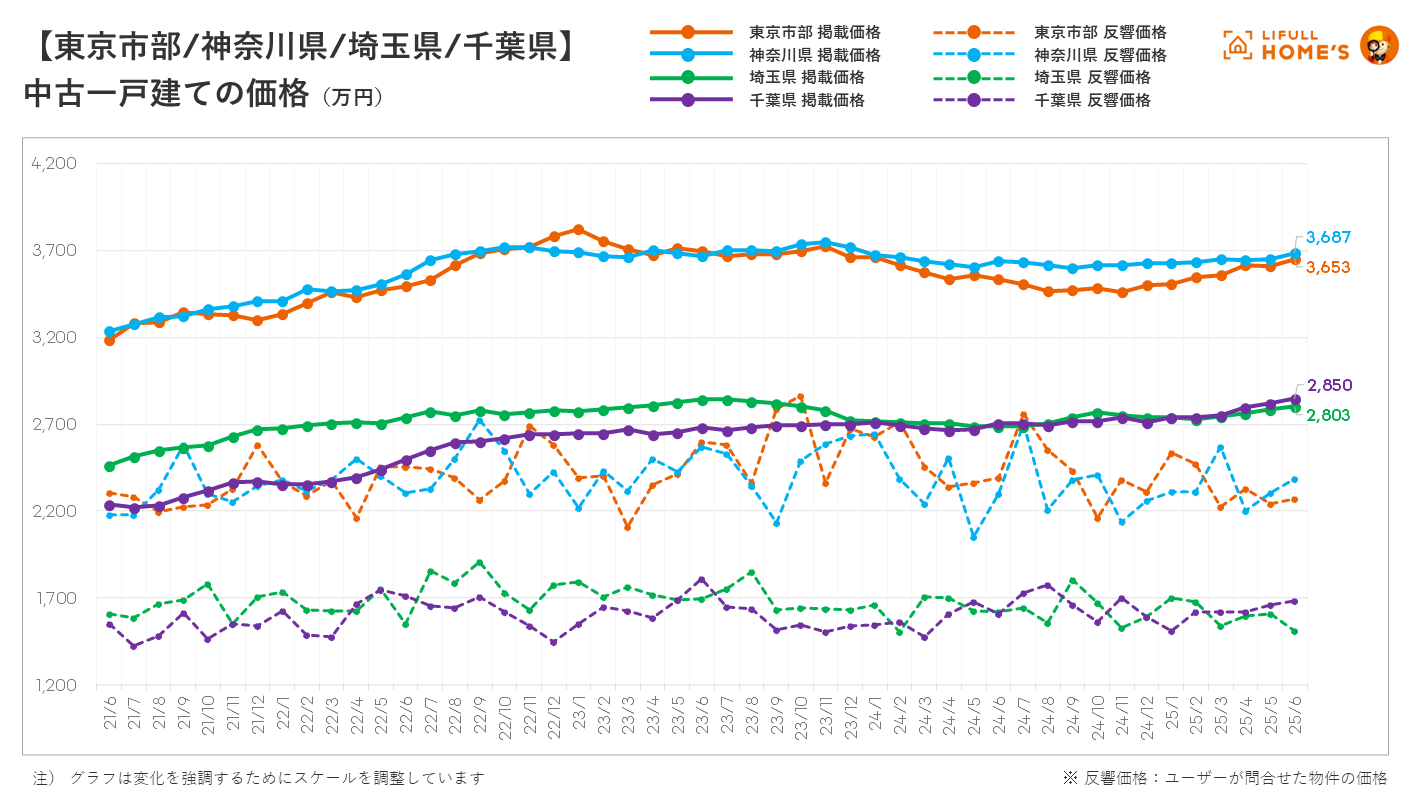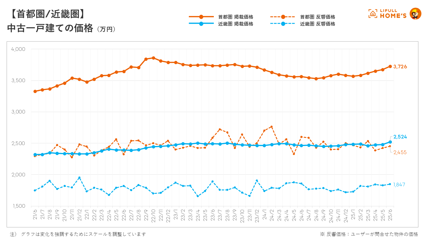 中古一戸建ての平均掲載価格は、首都圏(東京都、神奈川県、埼玉県、千葉県)が3,726万円(前年同月比104.5%)で2023年12月以来18ヶ月ぶりに3,700万円台まで回復しました。